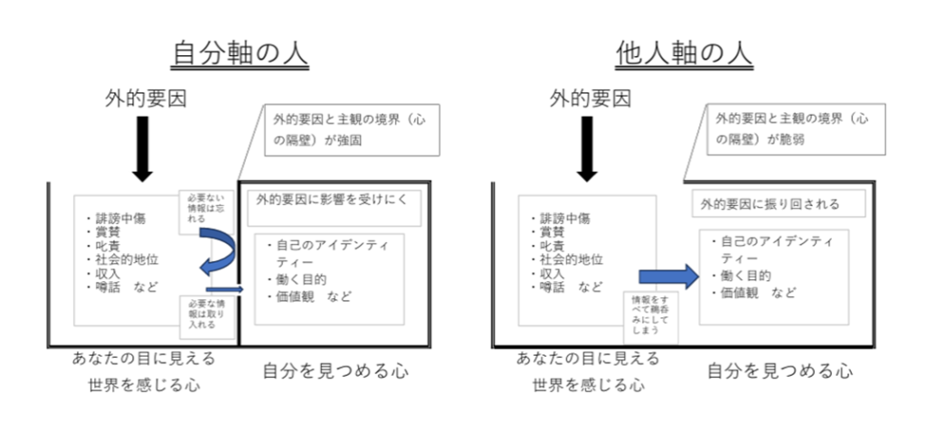 外的要因に鈍感になれと言っているのではないので注意していただきたいのです。他人の気持ちや空気を読むセンスはとても大切ですが、それによって自己のアイデンティティーが揺るがないように自分自身を客観的にみることが必要です。自分に起こった事象を客観的に見る能力を高めることを「抽象度を上げる」と言いますが、「抽象度が高い人」は他人から自分の言動を注意されても腹を立てずに自分の誤りを正すことが出来ます。正すべき行動は正せばいいし、指摘が間違っていれば受け入れる必要はありません。「その指摘は間違っている」と反論すれば良いのです。非難、注意、指摘を受けたときに感情が先に動いて腹が立って聴けないのは、他人軸の人の特徴です。 私は目に見える世界を感じる心(客観)と自分を見つめる心(主観)の間の壁を心の隔壁と呼んでいますが、心の隔壁が強ければ強いほど柔軟に他人の意見を聞けます。逆じゃないかと思われるかもしれませんが、外的要因で自分のアイデンティティーが揺らぐ状態だと怖くて自分を変えられません。ではどうしたら心の隔壁を強くできるのかという話を次回に述べたいと思います。